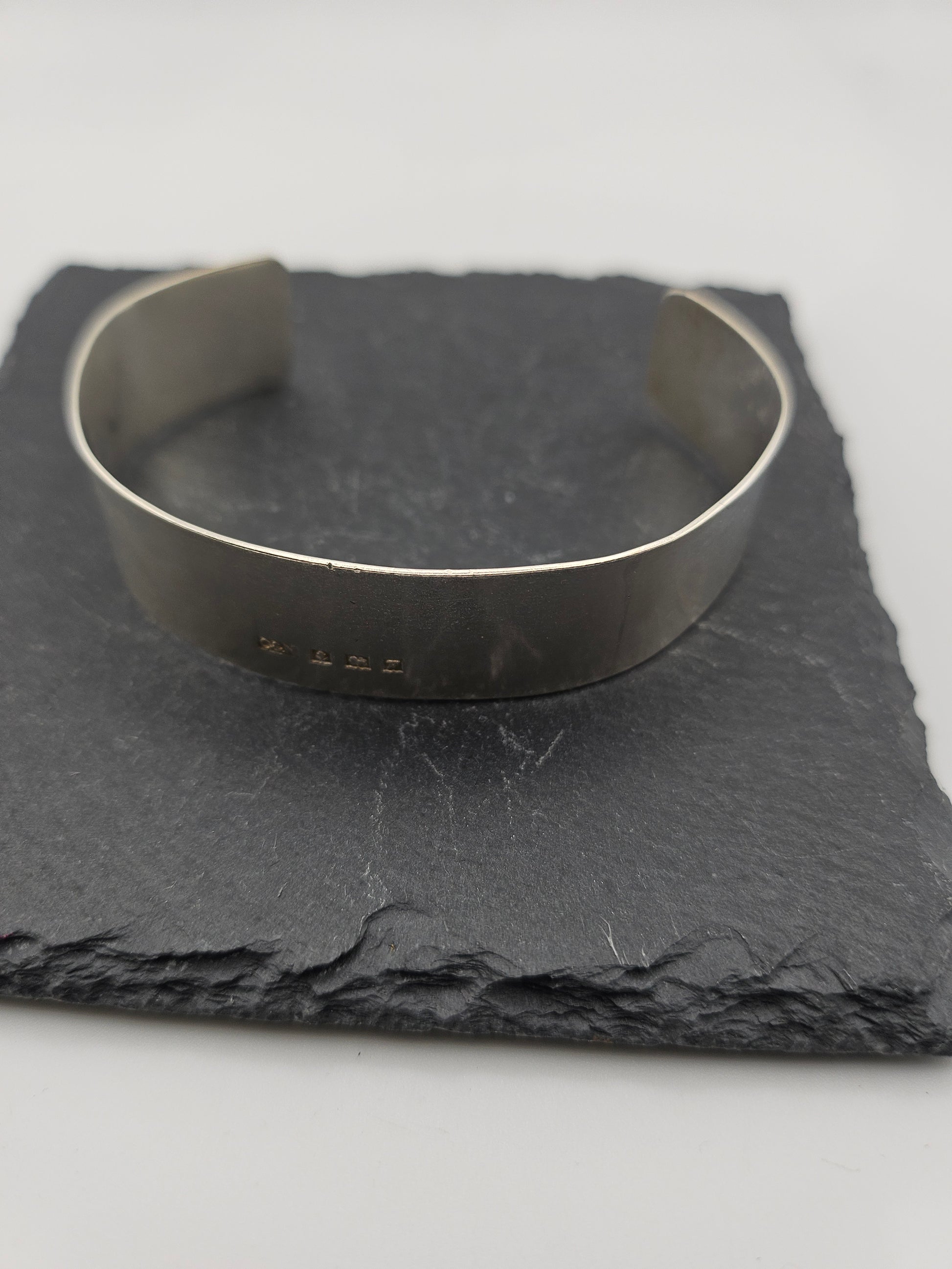 Small sized cuff bangle plain pattern with the hall mark visible on the front