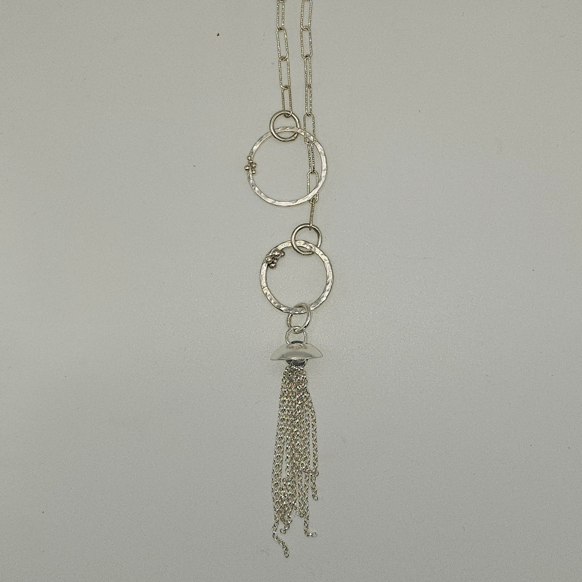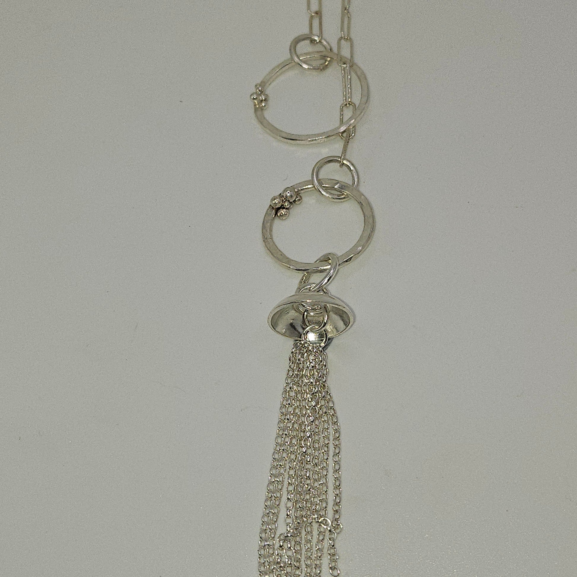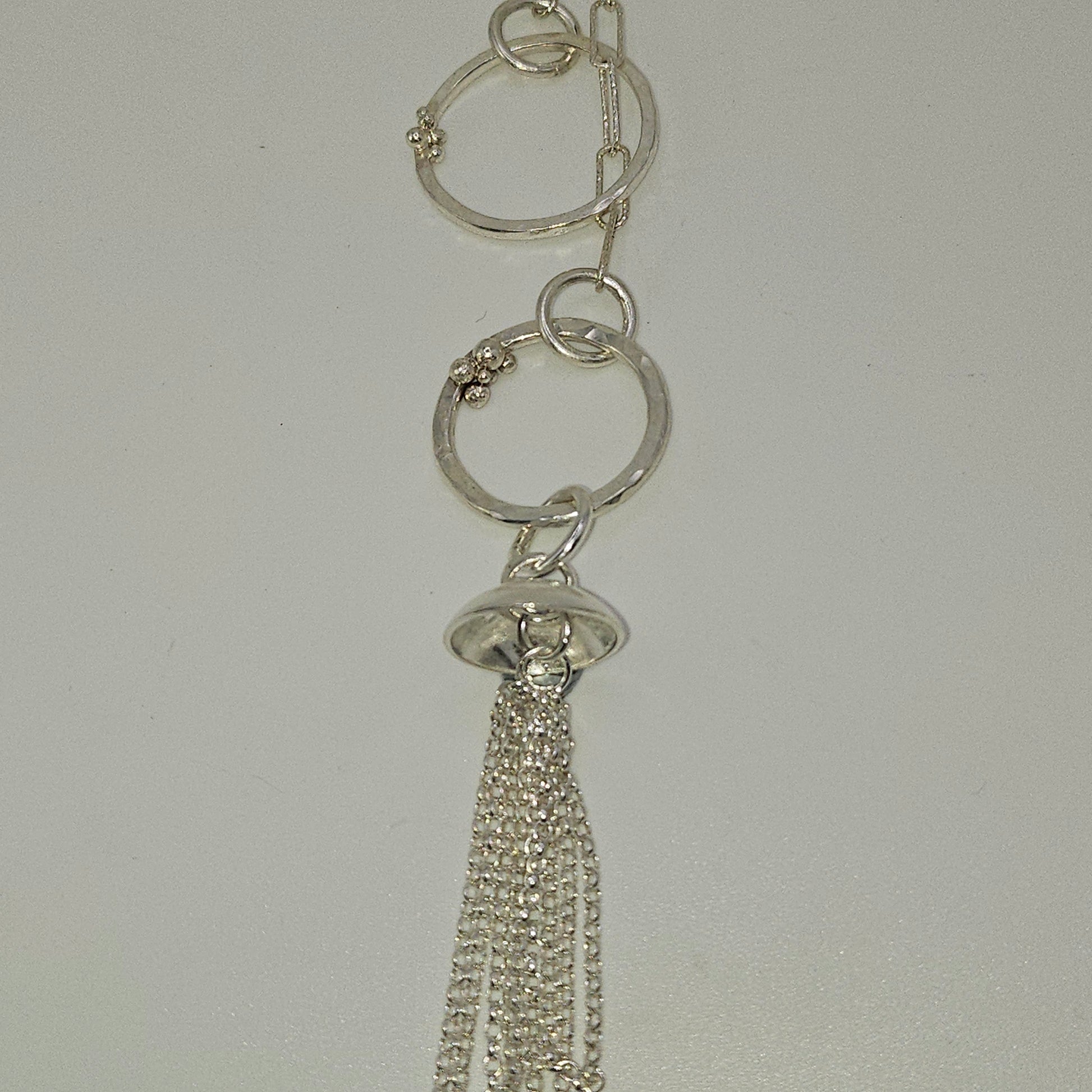 Stunning sterling silver slip chain necklace. With gorgeous hoops and a funky tassel chain attached the bottom.